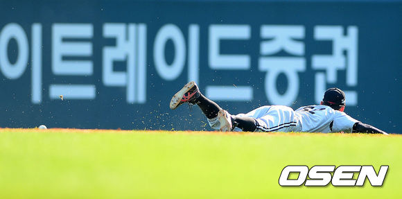5일 오후 서울 잠실야구장에서 열린 2013 한국야쿠르트 세븐프로야구 두산 베어스와 LG 트윈스의 경기, 7회말 2사 1,2루에서 LG 손주인이 두산 박세혁의 타구를 놓치고 있다. 박세혁은 우전 적시타를 기록했다.