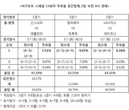 [야구토토] 국민체육진흥공단(www.kspo.or.kr)이 발행하는 체육진흥투표권 수탁사업자인 스포츠토토의 공식 온라인 발매 사이트 베트맨(www.betman.co.kr)이 오는 7일에 열리는 미프로야구(MLB) 3경기를 대상으로 한 야구토토 스페셜 13회차 투표율을 중간 집계한 결과, 참가자의 47.19%는 신시내티-애틀란타(1경기) 전에서 신시내티의 승리를 예상했다.