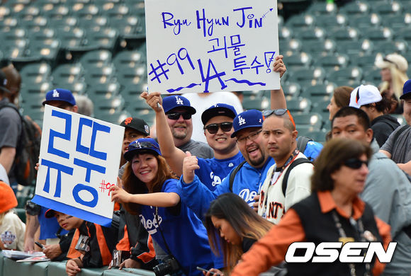 6일(이하 한국시간) 미국 샌프란시스코 AT&T 파크에서 열리는 '2013 메이저리그' 샌프란시스코 자이언츠와 대 LA 다저스의 경기를 앞두고 류현진의 팬들이 준비해온 응원 문구를 들어보이고 있다.