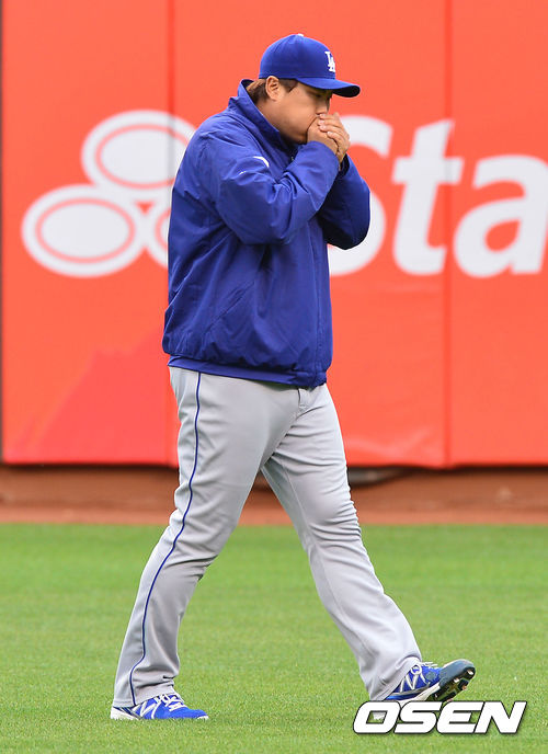 6일(이하 한국시간) 미국 샌프란시스코 AT&T 파크에서 열리는 '2013 메이저리그' 샌프란시스코 자이언츠와 대 LA 다저스의 경기를 앞두고 다저스 선발투수로 나서는 류현진이 외야에서 몸을 풀고 있다.