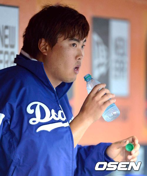 6일(이하 한국시간) 미국 샌프란시스코 AT&T 파크에서 열린 '2013 메이저리그' 샌프란시스코 자이언츠와 LA 다저스의 경기 류현진이 물을 마시고 있다.