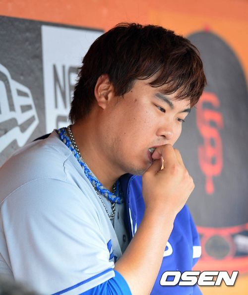 6일(이하 한국시간) 미국 샌프란시스코 AT&T 파크에서 열린 '2013 메이저리그' 샌프란시스코 자이언츠와 LA 다저스의 경기 3회초 류현진이 삼진으로 물러난 후 더그아웃에서 손톱 정리를 하고 있다.