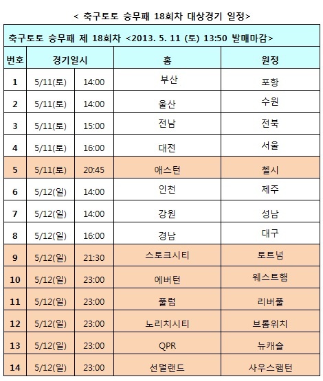 이밖에 에버턴-웨스트햄(10경기), QPR-뉴캐슬(13경기) 전 등이 대상경기로 선정됐다. 축구토토 승무패 18회차 게임은 11일 오후 1시 50분에 발매가 마감된다.
