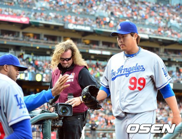 6일(이하 한국시간) 미국 샌프란시스코 AT&T 파크에서 열린 '2013 메이저리그' 샌프란시스코 자이언츠와 LA 다저스의 경기 4회말 수비를 가볍게 막은 류현진이 덕아웃으로 가고 있다.