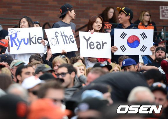 6일(이하 한국시간) 미국 샌프란시스코 AT&T 파크에서 열린 '2013 메이저리그' 샌프란시스코 자이언츠와 LA 다저스의 경기 교민들이 류현진을 응원하고 있다.