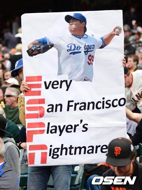 6일(이하 한국시간) 미국 샌프란시스코 AT&T 파크에서 열린 '2013 메이저리그' 샌프란시스코 자이언츠와 LA 다저스의 경기 류현진 팬이 재미있는 플래카드를 들고 응원을 하고 있다.