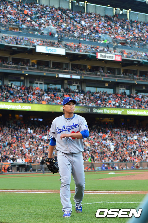 6일(이하 한국시간) 미국 샌프란시스코 AT&T 파크에서 '2013 메이저리그' 샌프란시스코 자이언츠와 대 LA 다저스의 경기가 열렸다. 6이닝 동안 4실점한 다저스 선발 류현진이 6회말 자이언츠의 공격을 마무리짓고 더그아웃으로 들어오고 있다.