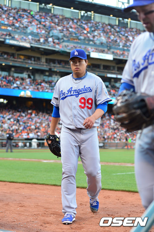 6일(이하 한국시간) 미국 샌프란시스코 AT&T 파크에서 '2013 메이저리그' 샌프란시스코 자이언츠와 대 LA 다저스의 경기가 열렸다. 6이닝 동안 4실점한 다저스 선발 류현진이 6회말 자이언츠의 공격을 마무리짓고 더그아웃으로 들어오고 있다.