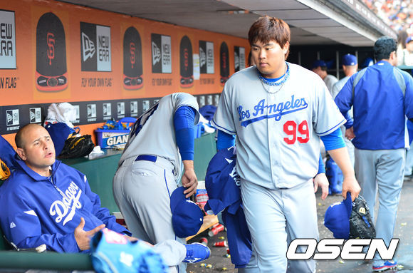 6일(이하 한국시간) 미국 샌프란시스코 AT&T 파크에서 '2013 메이저리그' 샌프란시스코 자이언츠와 대 LA 다저스의 경기가 열렸다. 6이닝 동안 4실점한 다저스 선발 류현진이 6회말 자이언츠의 공격을 마무리짓고 더그아웃을 빠져나가고 있다.