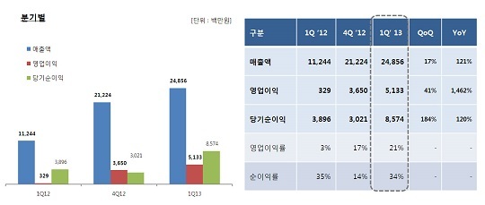 컴투스는 6일 실적발표를 통해 국제회계기준(K-IFRS) 연결 재무제표 기준으로 2013년 1분기 ▲매출 249억 원, ▲영업이익 51억 원, ▲당기순이익 86억 원의 성과를 달성했다고 발표했다.