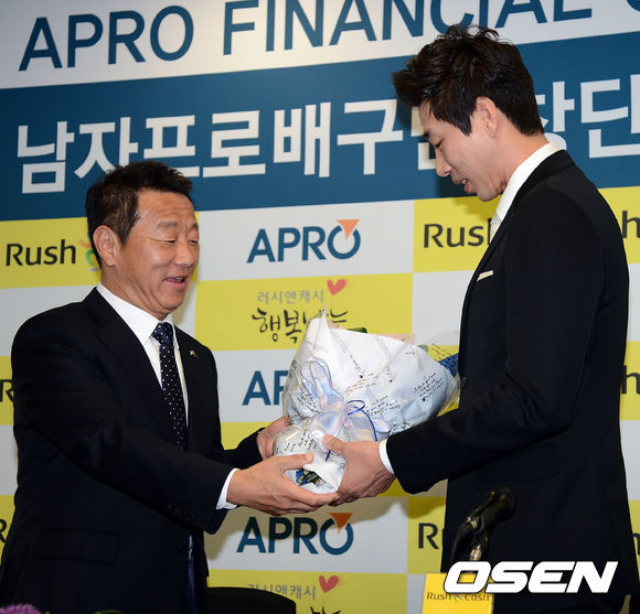 6일 오전 서울 강남구 역삼동 러시앤캐시 본사사옥에서 진행된 러시앤캐시 '남자 프로배구단 창단 및 김세진 감독 선임' 기자회견에서 러시앤캐시 최윤 회장이 김세진 감독에게 꽃다발을 건네고 있다.
