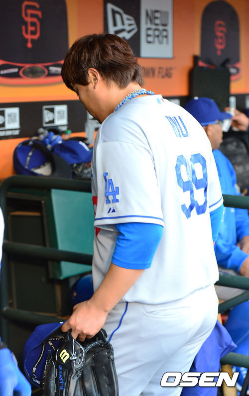 6일(이하 한국시간) 미국 샌프란시스코 AT&T 파크에서 '2013 메이저리그' 샌프란시스코 자이언츠와 대 LA 다저스의 경기가 열렸다. 6이닝 동안 4실점한 다저스 선발 류현진이 6회말 자이언츠의 공격을 마무리짓고 더그아웃을 빠져나가고 있다.