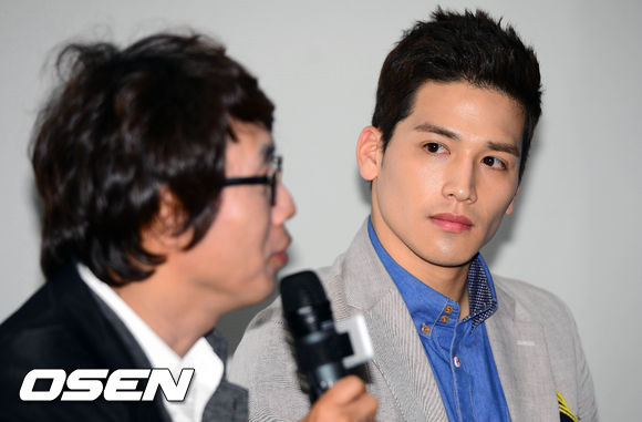 6일 오후 서울 태평로 스폰지하우스 광화문에서 열린 영화 '어디로 갈까요?' 언론배급시사회에서 유건이 취재진과 질의응답 시간을 갖고 있는 진승현 감독을 바라보고 있다.