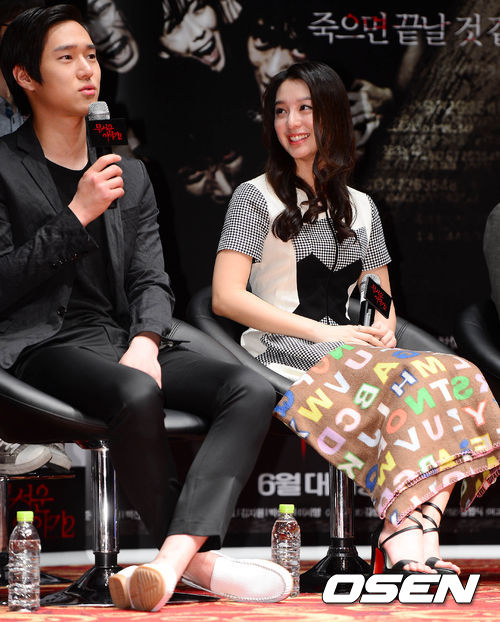 6일 오전 서울 자양동 롯데시네마 건대입구에서 열린 영화 '무서운 이야기2' 제작보고회에서 김지원이 취재진과 질의응답 시간을 갖고 있는 고경표를 바라보고 있다.