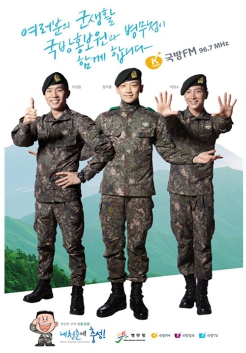 6일 국방홍보원 트위터에는 "병무청과 연계한 국방FM 홍보 포스터! 서울시 각 동사무소와 예비군 동대에서 만나보실 수 있어요"라는 글과 함께 비와 이특의 모습이 담긴 포스터가 공개됐다.