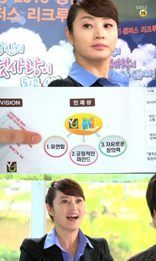 지난 6일 방송된 KBS 2TV 월화드라마 '직장의 신'에서는 명문대학교 졸업생이자 취업준비생들을 대상으로 리쿠르팅을 진행하는 미스김(김혜수 분)의 모습이 담겼다. 그는 '계약직'인 자신에게 와이장이 원하는 인재상이 어떤 것인지 구체적으로 묻는 학생에게 "유연함이란 회사가 월급을 적게 줘도 잘 지낼 수 있는 사람을 말하고 긍정적인 마인드는 회사가 월급을 적게 줘도 참을 수 있는 사람이다. 자유로운 창의력도 월급을 적게 줘도 야근까지 생각할 수 있는 젊은 사람을 원한다는 의미"라며 열변을 토했다.