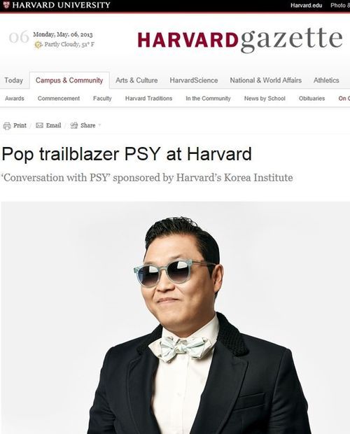 싸이는 오는 9일(현지시간) 미국 최고 명문 대학교인 하버드에서 전 세계 케이팝(K-POP) 열기와 한류의 의미에 대해 강연한다.