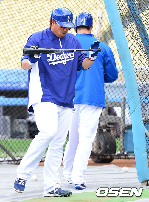 7일(이하 한국시간) 미국 캘리포니아 로스앤젤레스 다저스타디움에서 열리는 '2013 메이저리그' LA 다저스와 애리조나 다이아몬드백스 경기를 앞두고 다저스 류현진이 타격 연습을 마치고 방망이를 바라보고 있다.
