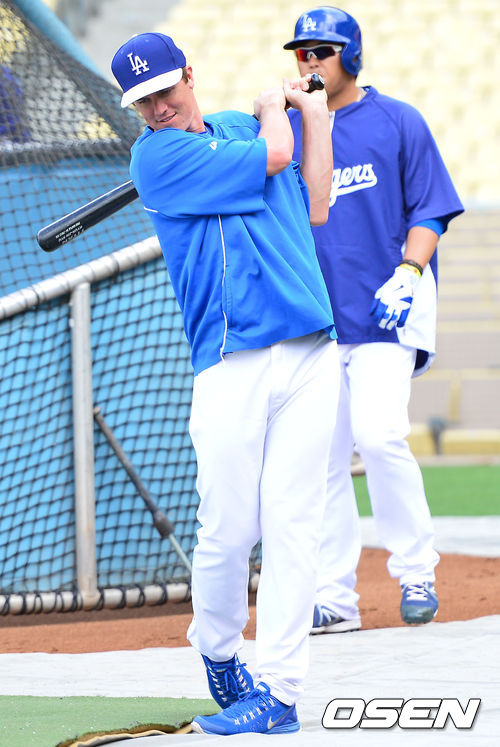 7일(이하 한국시간) 미국 캘리포니아 로스앤젤레스 다저스타디움에서 열리는 '2013 메이저리그' LA 다저스와 애리조나 다이아몬드백스 경기를 앞두고 다저스 류현진에게 방망이를 건네받은 잭 그레인키가 스윙 연습을 하고 있다.