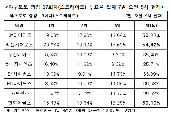 국민체육진흥공단(www.kspo.or.kr)이 발행하는 체육진흥투표권 수탁사업자인 스포츠토토 공식발매사이트인 베트맨(www.betman.co.kr)은 8일 개최되는 LG-넥센, SK-두산, KIA-롯데, NC-한화 등 4경기 8개팀을 대상으로 한 야구토토 랭킹 17회차 스트레이트 게임 중간집계결과 넥센(54.42%), KIA(50.22%), 한화(39.10%)를 차례로 다득점 상위 3개팀으로 꼽았다고 밝혔다. 반면 LG(30.58%), NC(30.58%), 롯데(25.71%)는 가장 적은 득점을 기록할 것으로 예상했다.