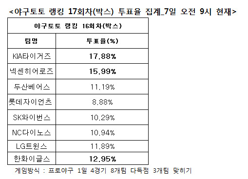 국내 야구팬들은 8일 열리는 야구토토 랭킹 17회차 대상 8개팀 가운데 넥센, KIA, 한화의 다득점을 예상하고 있는 것으로 나타났다.