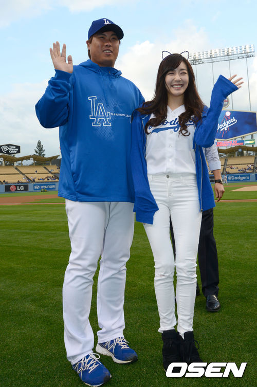 7일(이하 한국시간) 미국 캘리포니아 로스앤젤레스 다저스타디움에서 '2013 메이저리그' LA 다저스와 애리조나 다이아몬드백스 경기가 열렸다. 시구자로 나선 걸그룹 소녀시대의 티파니가 다저스 류현진과 기념촬영을 하고 있다.