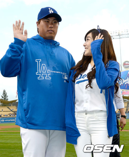 7일(이하 한국시간) 미국 캘리포니아 로스앤젤레스 다저스타디움에서 '2013 메이저리그' LA 다저스와 애리조나 다이아몬드백스 경기가 열렸다. 시구자로 나선 걸그룹 소녀시대의 티파니가 다저스 류현진과 기념촬영을 준비하며 대화를 나누고 있다.