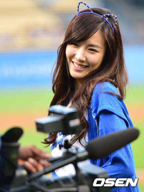 7일(이하 한국시간) 미국 캘리포니아 로스앤젤레스 다저스타디움에서 '2013 메이저리그' LA 다저스와 애리조나 다이아몬드백스 경기가 열렸다. 시구자로 나선 걸그룹 소녀시대의 티파니가 취재진과 인터뷰를 나누며 미소짓고 있다.