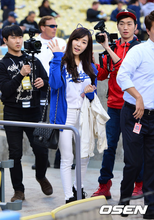 7일(이하 한국시간) 미국 캘리포니아 로스앤젤레스 다저스타디움에서 '2013 메이저리그' LA 다저스와 애리조나 다이아몬드백스 경기가 열렸다. 시구자로 나선 걸그룹 소녀시대의 티파니가 취재진을 향해 인사하고 있다.