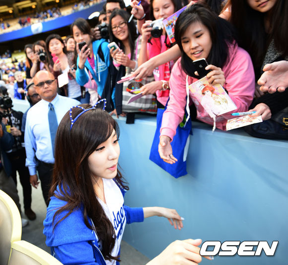 7일(이하 한국시간) 미국 캘리포니아 로스앤젤레스 다저스타디움에서 '2013 메이저리그' LA 다저스와 애리조나 다이아몬드백스 경기가 열렸다. 시구자로 나선 걸그룹 소녀시대의 티파니가 팬들과 인사를 나누고 있다.