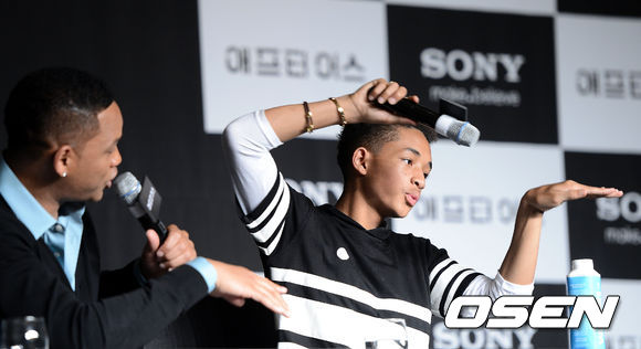 7일 오전 서울 여의도 콘래드 서울에서 진행된 영화 '애프터 어스' 윌스미스 내한 기자회견에서 제이든 스미스가 영화 장면을 설명하고 있다.