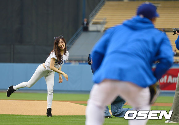 7일(이하 한국시간) 미국 캘리포니아 로스앤젤레스 다저스타디움에서 '2013 메이저리그' LA 다저스와 애리조나 다이아몬드백스 경기가 열렸다. 시구자로 나선 걸그룹 소녀시대의 티파니가 다저스 류현진을 향해 힘차게 공을 던진 뒤 환하게 미소짓고 있다.