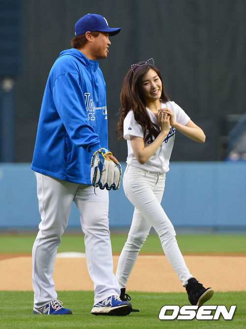 7일(이하 한국시간) 미국 캘리포니아 로스앤젤레스 다저스타디움에서 '2013 메이저리그' LA 다저스와 애리조나 다이아몬드백스 경기가 열렸다. 시구자로 나선 걸그룹 소녀시대의 티파니가 다저스 류현진을 향해 힘차게 공을 던진 뒤 기념촬영을 마치고 이동하고 있다.