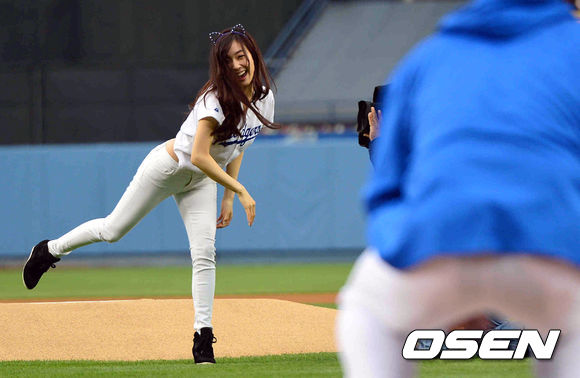 7일(이하 한국시간) 미국 캘리포니아 로스앤젤레스 다저스타디움에서 '2013 메이저리그' LA 다저스와 애리조나 다이아몬드백스 경기가 열렸다. 시구자로 나선 걸그룹 소녀시대의 티파니가 다저스 류현진을 바라보며 시구를 하고 있다.