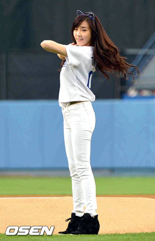 7일(이하 한국시간) 미국 캘리포니아 로스앤젤레스 다저스타디움에서 '2013 메이저리그' LA 다저스와 애리조나 다이아몬드백스 경기가 열렸다. 시구자로 나선 걸그룹 소녀시대의 티파니가 다저스 류현진을 바라보며 몸을 풀고 있다.