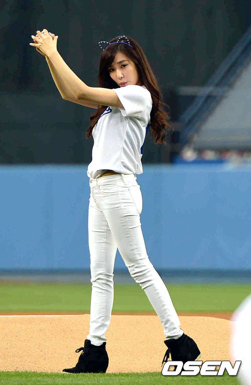 7일(이하 한국시간) 미국 캘리포니아 로스앤젤레스 다저스타디움에서 '2013 메이저리그' LA 다저스와 애리조나 다이아몬드백스 경기가 열렸다. 시구자로 나선 걸그룹 소녀시대의 티파니가 다저스 류현진을 바라보며 시구 포즈를 취하고 있다.