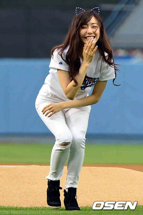 7일(이하 한국시간) 미국 캘리포니아 로스앤젤레스 다저스타디움에서 '2013 메이저리그' LA 다저스와 애리조나 다이아몬드백스 경기가 열렸다. 시구자로 나선 걸그룹 소녀시대의 티파니가 시구를 끝내고 미소짓고 있다.