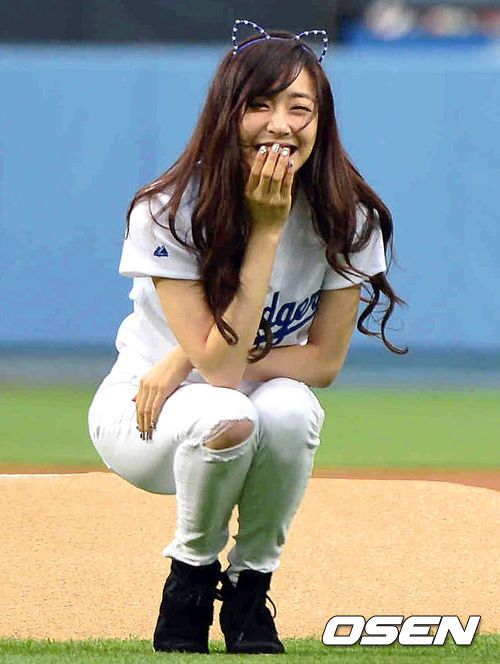 7일(이하 한국시간) 미국 캘리포니아 로스앤젤레스 다저스타디움에서 '2013 메이저리그' LA 다저스와 애리조나 다이아몬드백스 경기가 열렸다. 시구자로 나선 걸그룹 소녀시대의 티파니가 시구를 끝내고 미소짓고 있다.