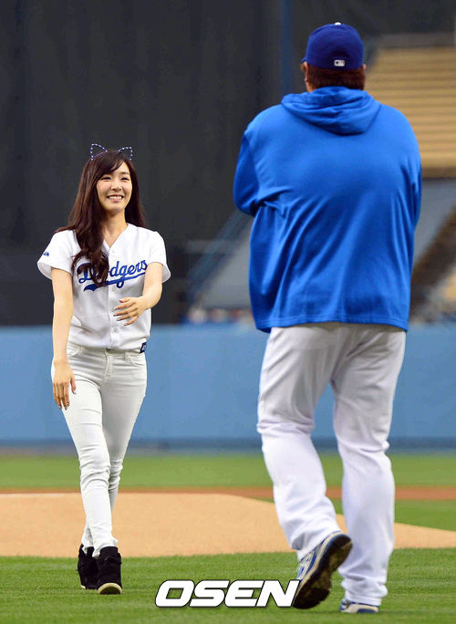 7일(이하 한국시간) 미국 캘리포니아 로스앤젤레스 다저스타디움에서 '2013 메이저리그' LA 다저스와 애리조나 다이아몬드백스 경기가 열렸다. 시구자로 나선 걸그룹 소녀시대의 티파니와 류현진이 인사를 나누고 있다.
