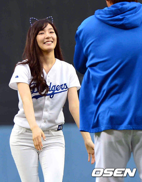 7일(이하 한국시간) 미국 캘리포니아 로스앤젤레스 다저스타디움에서 '2013 메이저리그' LA 다저스와 애리조나 다이아몬드백스 경기가 열렸다. 시구자로 나선 걸그룹 소녀시대의 티파니와 류현진이 인사를 나누고 있다.