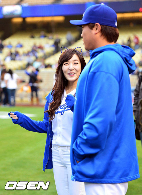 시구자로 나선 걸그룹 소녀시대의 티파니가 류현진을 바라보며 미소짓고 있다.