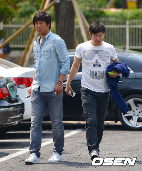 7일 오후 광주 무등구장에서 열리는 '2013 한국야쿠르트 세븐 프로야구' KIA 타이거즈와 롯데 자이언츠의 경기에 앞서 전날 트레이드된 송은범과 신승현이 출근하고 있다