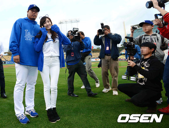 시구자로 나선 걸그룹 소녀시대의 티파니와 류현진이 기념촬영을 하고 있다.