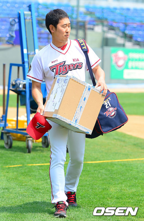 7일 오후 광주 무등구장에서 열리는 '2013 한국야쿠르트 세븐 프로야구' KIA 타이거즈와 롯데 자이언츠의 경기에 앞서 KIA 윤석민이 소포 꾸러미를 들고 경기장에 들어서고 있다