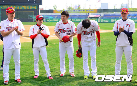 7일 오후 광주 무등구장에서 열리는 '2013 한국야쿠르트 세븐 프로야구' KIA 타이거즈와 롯데 자이언츠의 경기에 앞서 전날 트레이드된 송은범과 신승현이 동료들에게 인사를 하고 있다