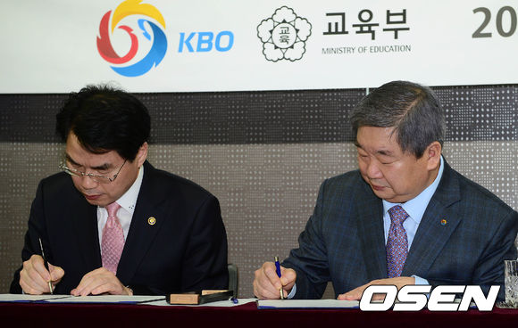7일 오후 서울 도곡동 야구회관에서 열린 한국야구위원회(KBO)와 교육부의 '야구를 통한 학교스포츠클럽 활성화 및 재능기부' MOU 체결식에서 나승일 교육부 차관(왼쪽)과 구본능 KBO 총재가 협약서를 사인을 하고 있다.