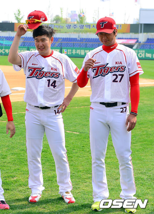 7일 오후 광주 무등구장에서 열리는 '2013 한국야쿠르트 세븐 프로야구' KIA 타이거즈와 롯데 자이언츠의 경기에 앞서 전날 트레이드된 송은범과 신승현이 동료들에게 첫 인사를 나누고 있다