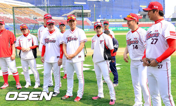 7일 오후 광주 무등구장에서 열리는 '2013 한국야쿠르트 세븐 프로야구' KIA 타이거즈와 롯데 자이언츠의 경기에 앞서 전날 트레이드된 송은범과 신승현이 동료들에게 첫 인사를 나누고 있다