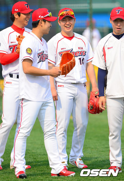 7일 오후 광주 무등구장에서 열리는 '2013 한국야쿠르트 세븐 프로야구' KIA 타이거즈와 롯데 자이언츠의 경기, 경기에 앞서 전날 트레이드된 송은범과 신승현이 훈련 중 미소 짓고 있다