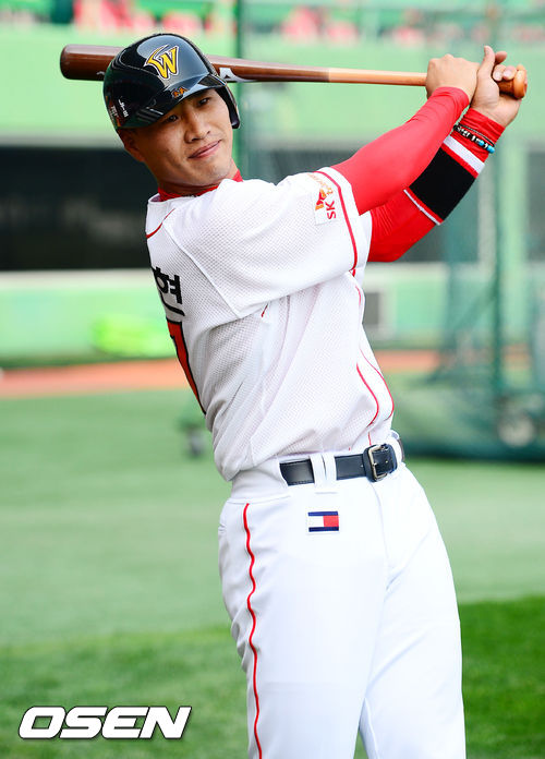 7일 오후 인천 문학구장에서 열린 2013 한국야쿠르트 세븐프로야구 SK 와이번스와 두산 베어스의 경기 전 SK 유니폼을 입은 김상현이 타격 포즈를 취하고 있다.